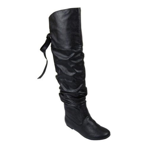 Tie straps on a slouched over-the-knee flat heel boots fashioned in leatherette. Cushion insole with traction sole. Approx. boot shaft height: 20"; 16" calf circumference. Material: Synthetic Style Name: Letta (SKU: LETTA-BLK-PU)